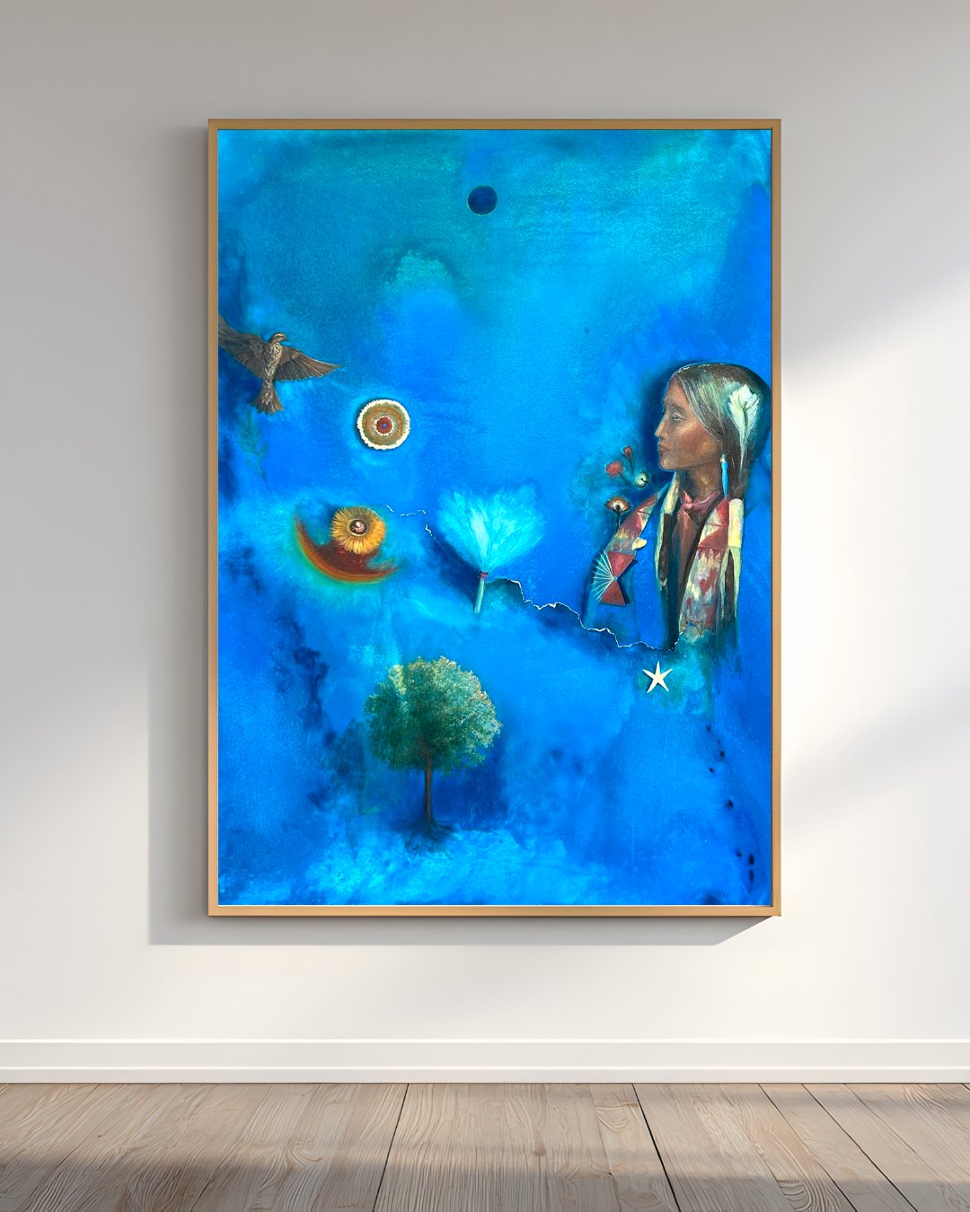 This original piece has slowly been completed over the past years and is an ode to the Great Spirit, and to indigenous wisdom keepers who honour true connection to life, death, the temporal and the infinite.